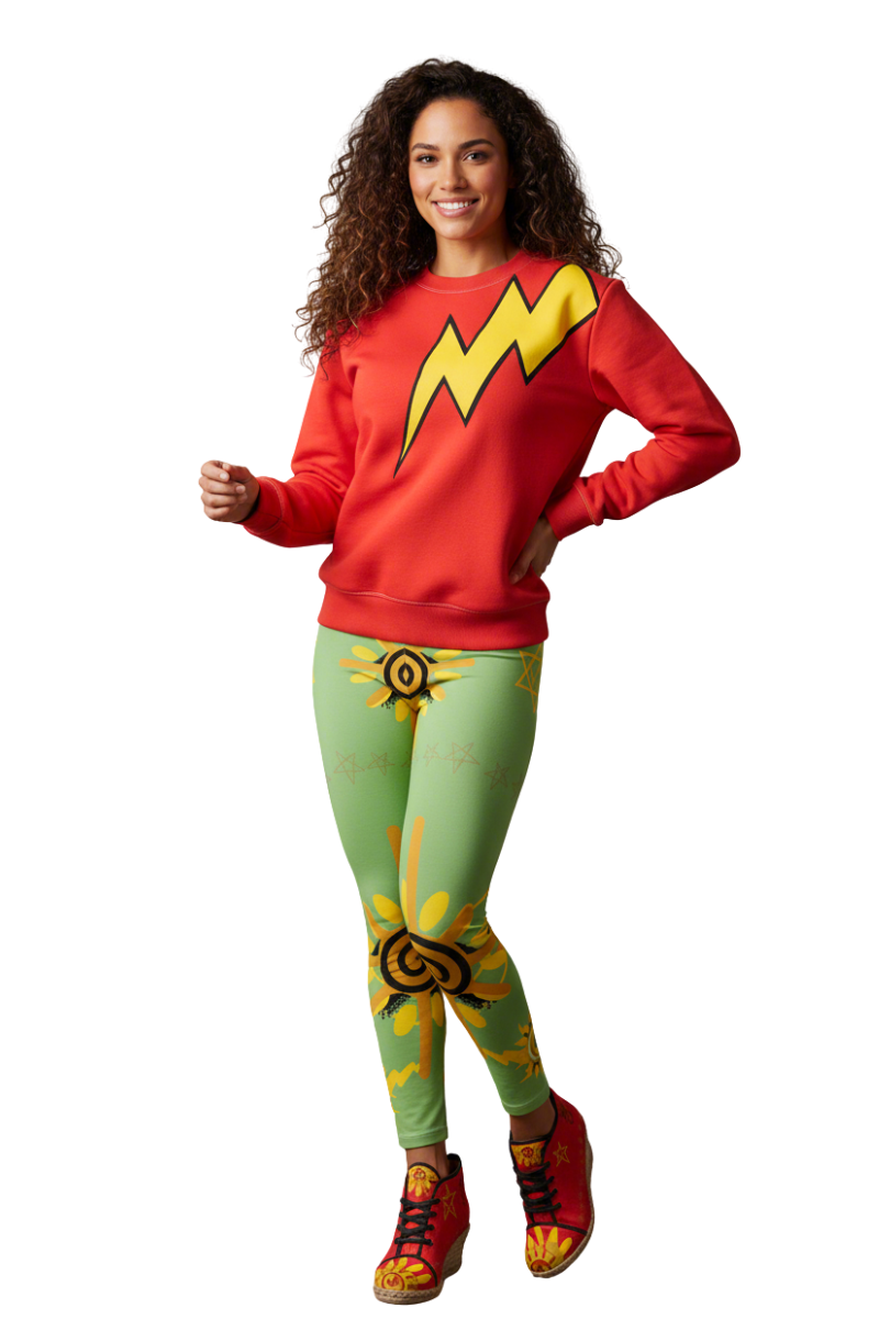 Command attention in this striking cosmic red sweatshirt, adorned with bold yellow lightning strikes.